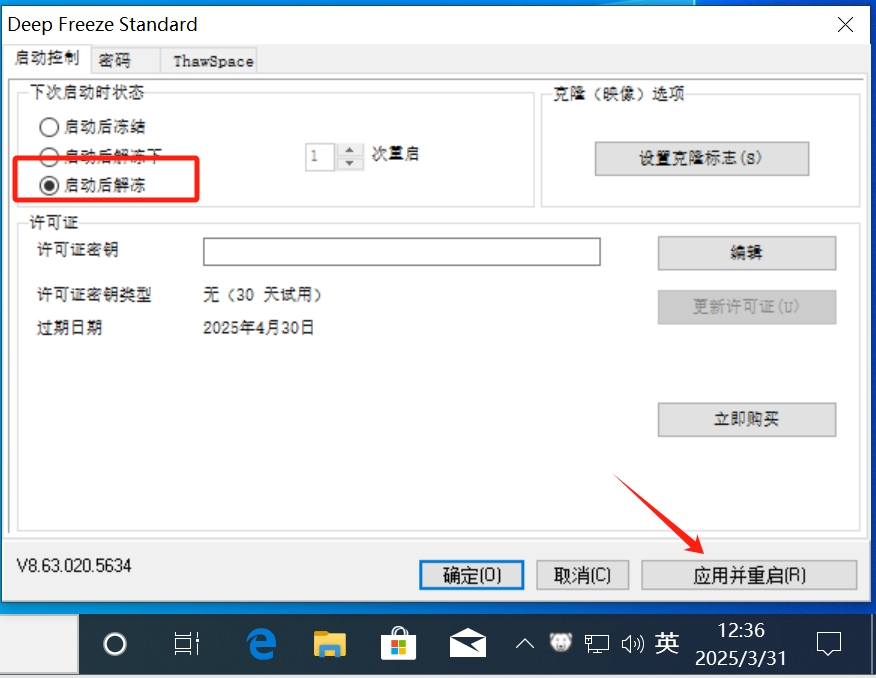 首先,按住shift键双击冰熊图标,呼出Deep Freeze冰点还原,输入密码进入Deep Freeze冰点还原,选择第三个选项,解冻冰点,并点击应用并重启。(如下图)
