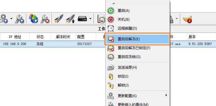 2、全选所有的计算机,右键,点击“重启后解冻”,就批量关闭冰点了,是不是非常简单(如下图)