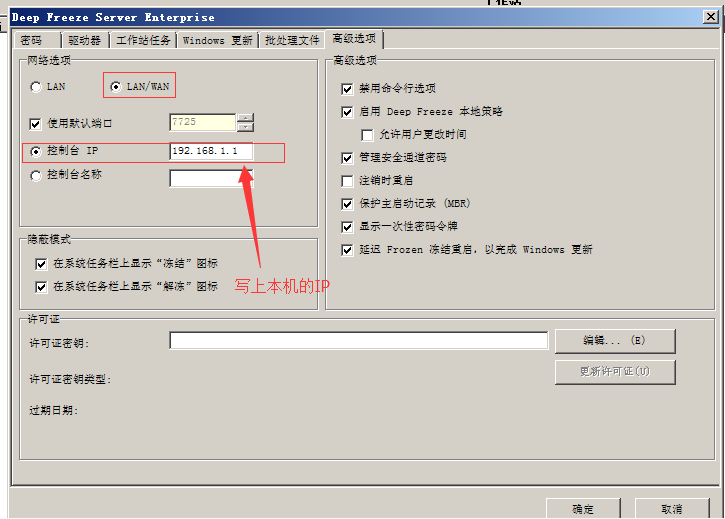 高级选项,注意:选择LAN接口 控制台IP一定要是安装控制中心的本机固定IP地址。