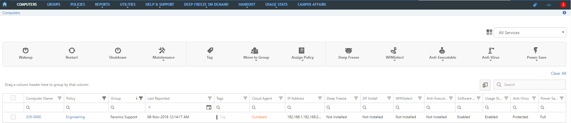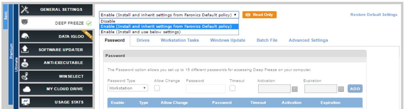 现在,可以将策略配置为继承Faronics Default策略的设置,以便在多个策略中快速分发设置更改。 设置可以根据服务和维护周期单独继承。