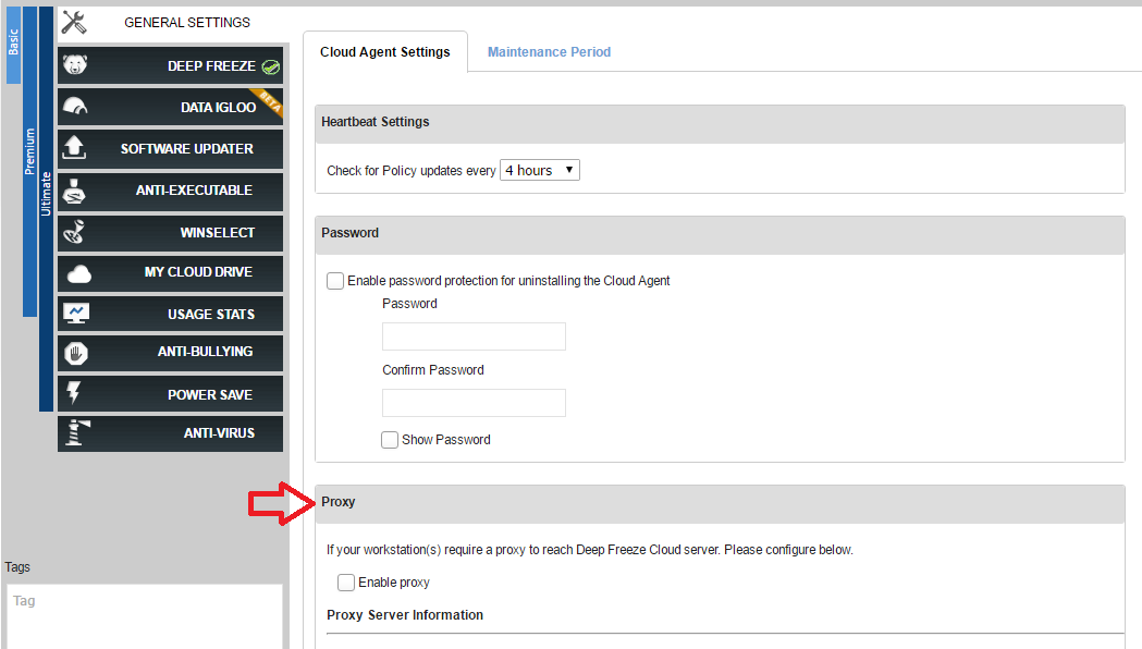 如果使用代理服务器连接到Internet,则可以在Deep Freeze Cloud中指定凭据。 代理服务器设置将允许Deep Freeze Cloud与Cloud Agent通信,以执行来自Deep Freeze Cloud的命令,通过软件更新程序服务更新应用程序,并更新防病毒服务的病毒定义。