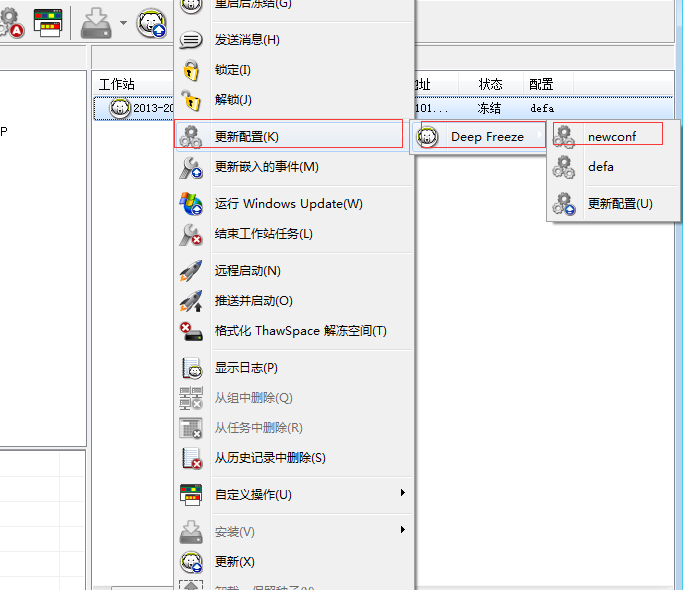 冰点还原精灵DeepFreeze企业版更新配置文件作者: 冰点还原 / 2016-12-07 试用场景:需要对部分用户采取不一样的配置 步骤:先创建好新的配置文件 选择需要相应的客户端,右键更新配置. 重启相应的客户端,应用配置.