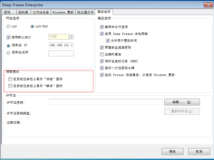 冰点还原精灵DeepFreeze企业版隐蔽模式作者: 冰点还原 / 2017-01-05 隐蔽模式:客户端上的机器右下角不会显示冰点还原的图标,必须使用键盘快捷键 CTRL+ALT+SHIFT+F6 来访问登录窗口。 步骤: 1.打开配置文件 点击高级选项卡 根据需求勾选相应的功能。