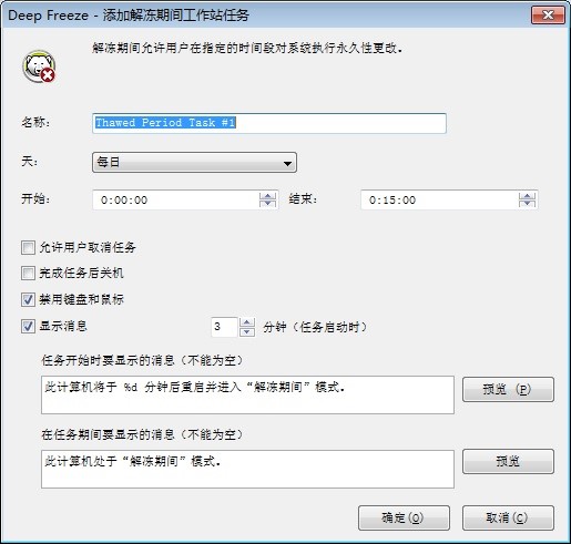 以上示例屏幕中创建了一个 Thawed 期间任务:每天上午 12:00 到 12:15 期间执行。在任务启动之前,用户不能取消该任务。在执行维护后,计算机不会关闭。维护期间,键盘和鼠标会被禁用。该任务配置为在任务启动之前 5 分钟向用户显示一条消息。上午 11:55 在计算机上将显示以下消息:此计算机将于 5 分钟后重启并进入 Thawed 期间。