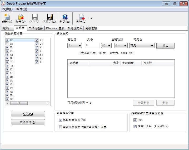 “驱动器”选项卡用于选择将处于 Frozen(受 Deep Freeze 保护)或 Thawed(不受保护)状态的驱动器。您也可以创建一个 ThawSpace——由 Frozen 或者 Thawed 驱动器托管的虚拟分区,这里的数据可以永久保存,在重新启动时不会被删除。