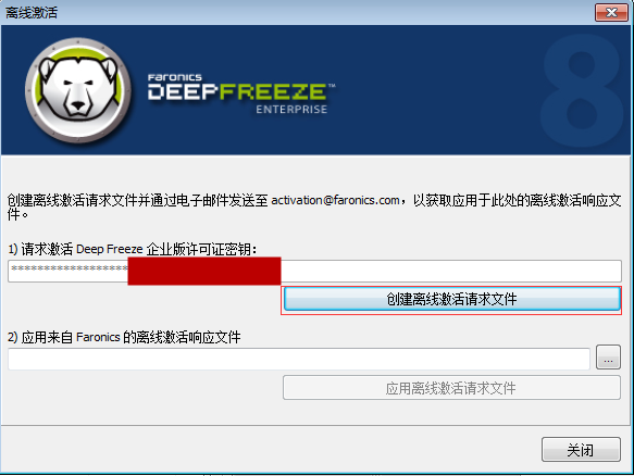 点击创建离线激活请求文件,会生成一个.bin文件,将这个文件以邮件的形式发送到activation@faronics.com.成功后后你的邮箱会收到一封邮件,里面有一个附件,那个附件就是离线激活响应文件.