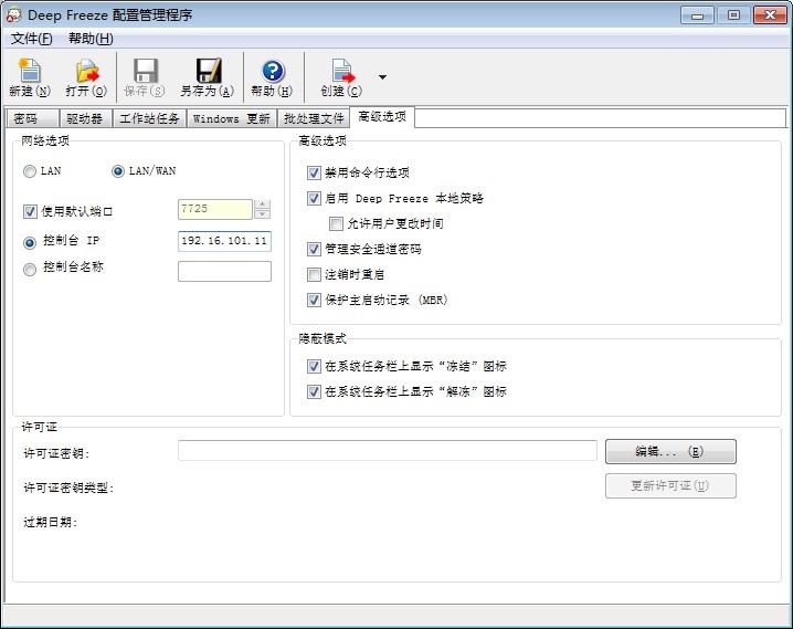 为了使客户端可见,需要将其配置为使用 LAN/WAN 连接。选中 LAN/WAN 选项时,会出现控制台 IP 字段。在此为要运行企业控制台的计算机指定 IP。下面的高级选项选项卡上显示了这些设置的示例: