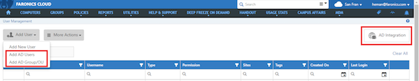 1. Active Directory用户管理 – Active Directory用户现在可以使用其Active Directory凭据登录到Deep Freeze Cloud。 网站和权限可以直接分配给AD用户,也可以根据其AD组成员资格继承。