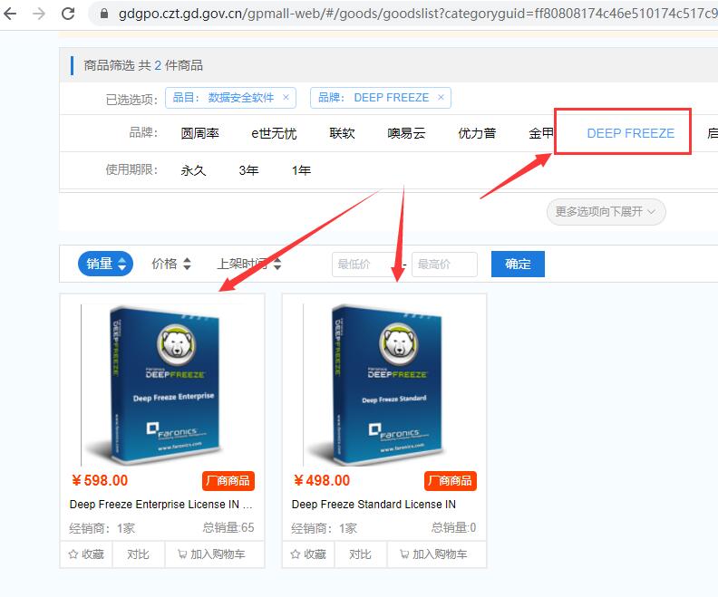 4、选择商品,两个,一个为deepfreeze冰点标准版,一个为deepfreeze冰点企业版本。