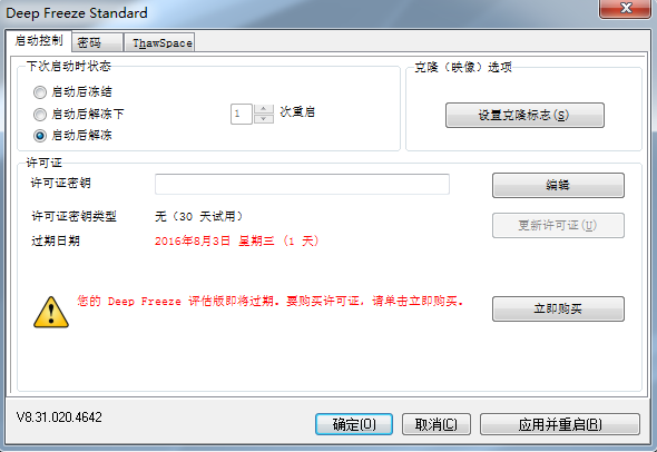 1,因为是系统保护程序,所以在控制面板是无法卸载冰点的,需要使用热键呼出冰点界面,输入之前设置的密码(没有设置密码直接跳过),选择启动控制下的重启后解冻,然后点击应用并重启,找到之前下载的安装文件,点击安装会弹出卸载的界面,点击卸载即可。