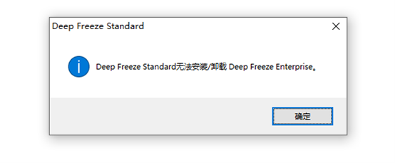 最近有客户反馈,安装冰点还原标准版出现提示:“Deep Freeze standard无法安装卸载 Deep Freeze Enterprise”,重启也不行,且没有图标。如下图