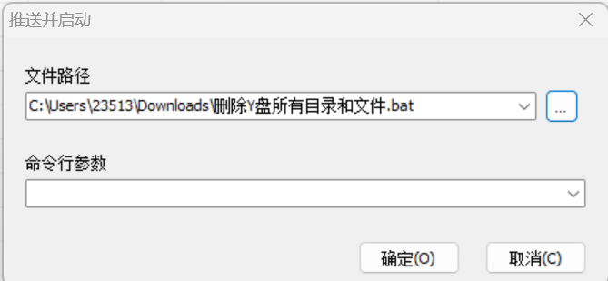 选择写好的BAT文件,”删除Y盘所有目录和文件.bat“,点击确定即可,然后等一会儿,你再看Y盘,所有的目录和文件已被清空了。