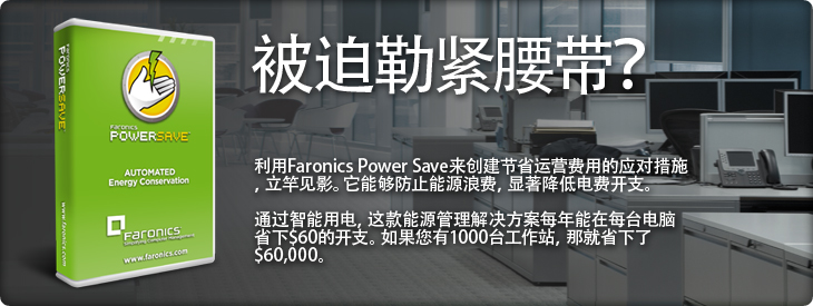 Power Save 使用Faronics Power Save来生成智能能源管理方案,节约运营费用开支,可谓易如反掌。这款可轻松扩展使用规模的解决方案对于Windows和Mac电脑都适用,有助于您最大化能源利用效率,为您节省更多开支。此外,内建的报表功能可以清晰反应出您的节省成果,以及您的ROI。 Power Save 企业版 Faronics Power Save能有效防止电脑能源浪费,能源节省高达50%,同时不影响工作效率。 了解更多 Power Save Mac 版 Faronics Power Save是一款针对Mac设计的企业级别智能电源管理解决方案。 了解更多
