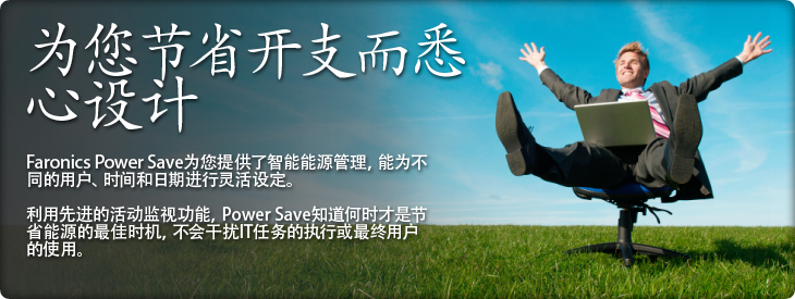 防护原理 日趋紧张的财政开支意味着IT专家们把一块钱掰两半来花都可能还嫌不够,但我们也已为你们安排好一切。Faronics Power Save能为您的公司带来的开支节省效果立竿见影。这是一款智能能源管理解决方案,能够防止能源浪费,让您花费的冤枉钱都回到您的口袋中。假设您的单位里有1,000台电脑。通过有效节省能源开支,单单在第一年内您就能节省$50,000的花销。想象一下,倘若能有这么大一笔钱,您能够创造出哪些效益! 现在就来计算一下能节省多少开支吧 这款智能解决方案在后台运作,不会影响最终用户的使用或IT任务的执行。Faronics Power Save设计时就考虑好了一切,内建有智能判断机制,能够准确判断电脑不活跃的状态,实现按时关机。它会对CPU、磁盘、网络、键盘、鼠标、应用程序状态数据进行仔细分析之后才采取节能操作,保证您的用户不会在处理要务途中受到干扰。作为第二重安全把关措施,它会在开始执行操作前提醒用户,并会自动储存已打开的工作。 使用内建的Faronics Core Console,您也可以轻而易举地管理公司内部所有电脑的节能情况。您可以轻松安排唤醒、关机或重启事件,同时还能够对您的配置进行精细调整。创建多个Power Plan(节能计划)让您能够满足不同级别的需求,同时为恰当的日期和时间创建节能效果最为明显的节能方案,增加您的节约效果。当您需要演示快速增长的ROI时,Power Save能够根据本地电价生成详尽的能源使用和节能报表,让您能够轻松应对。让您能够清楚知道每一天都能省下多少额外开支。 |